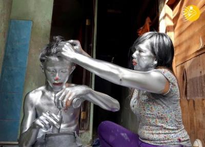 در استان جاوه غربی اندونزی زنی برای تأمین هزینه زندگی خود را با رنگ نقره ای رنگ می نماید و به تکدی گری می پردازد.