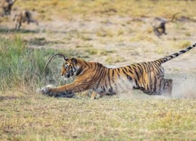 گروهی از میمون های بازیگوش از حمله یک ببر که در کمین برای شکار آن ها نشسته بود غافلگیر شدند. این اتفاق در پارک ملی بانداوگار استان مادیاپرداش رخ داد.